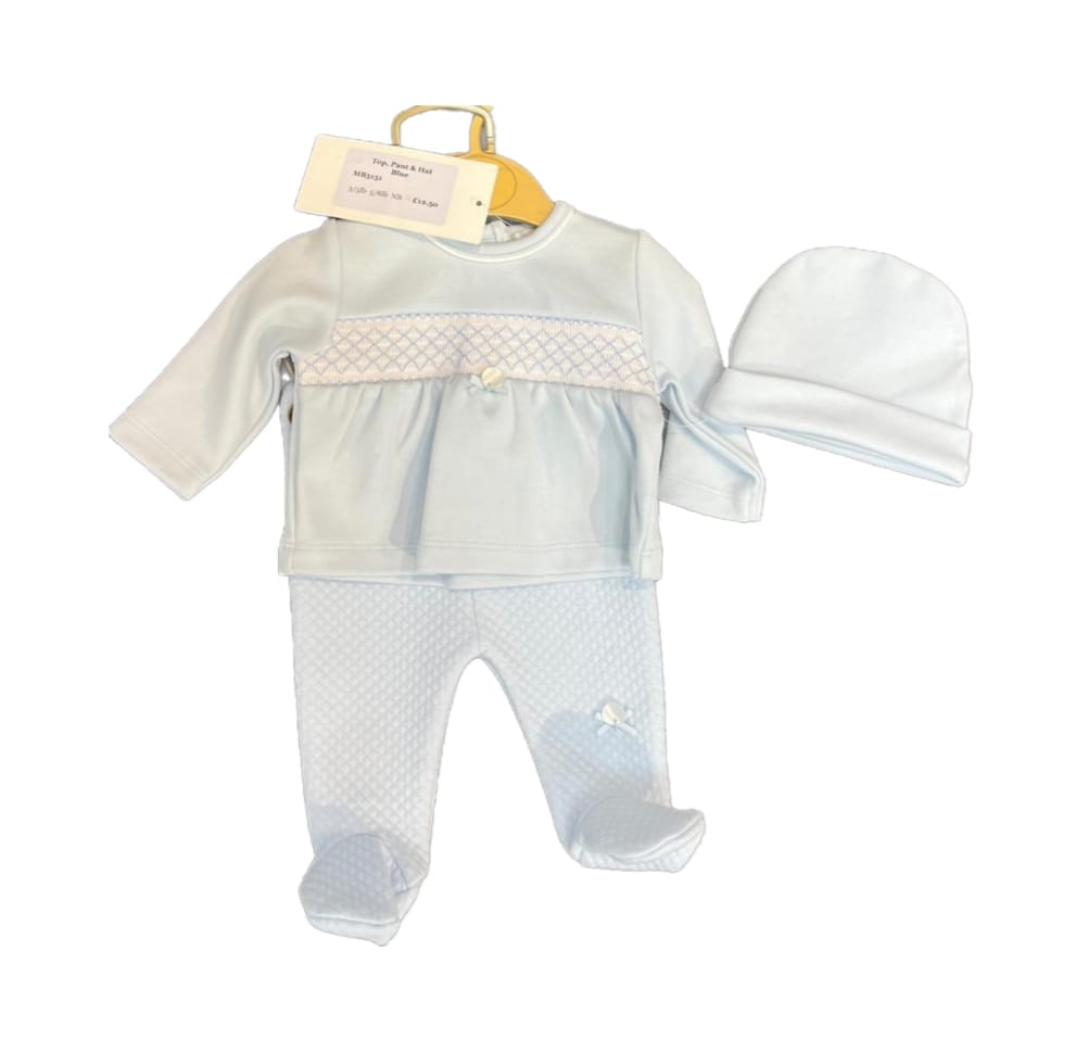 - Smocked long sleeved top, trousers and hat
